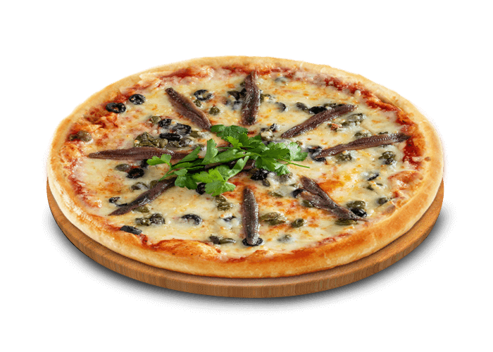Sauce tomate, mozzarella, câpres, anchois, origan.